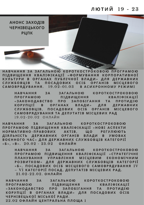 З 26 по 29 лютого 2024 року проходить короткостроковий семінар за дистанційною формою навчання в режимі онлайн за допомогою платформи Google Meet «Формування корпоративної культури в органах публічної влади» для державних службовців апарату, структурних підрозділів обласної військової адміністрації, районних військових адміністрацій та органів місцевого самоврядування. далі » |